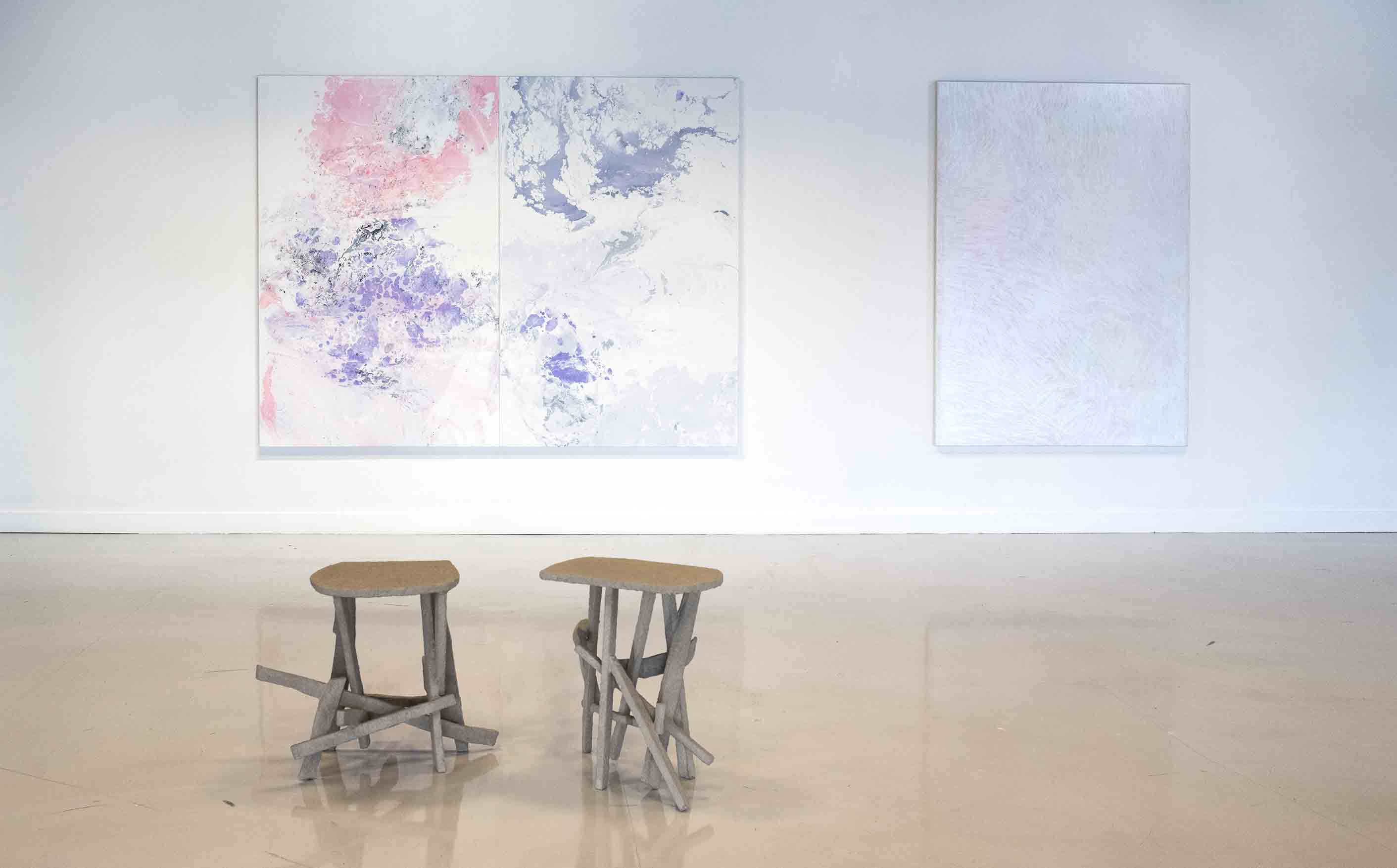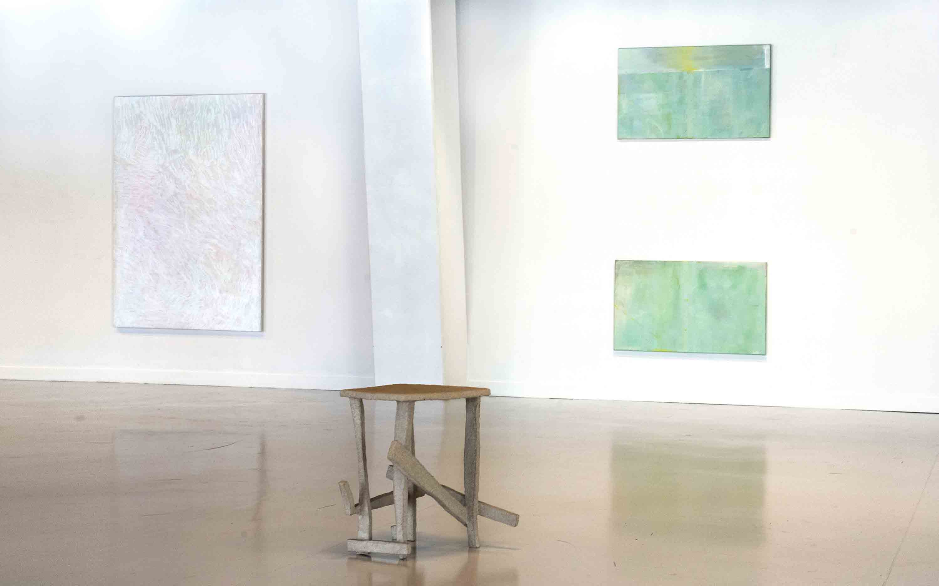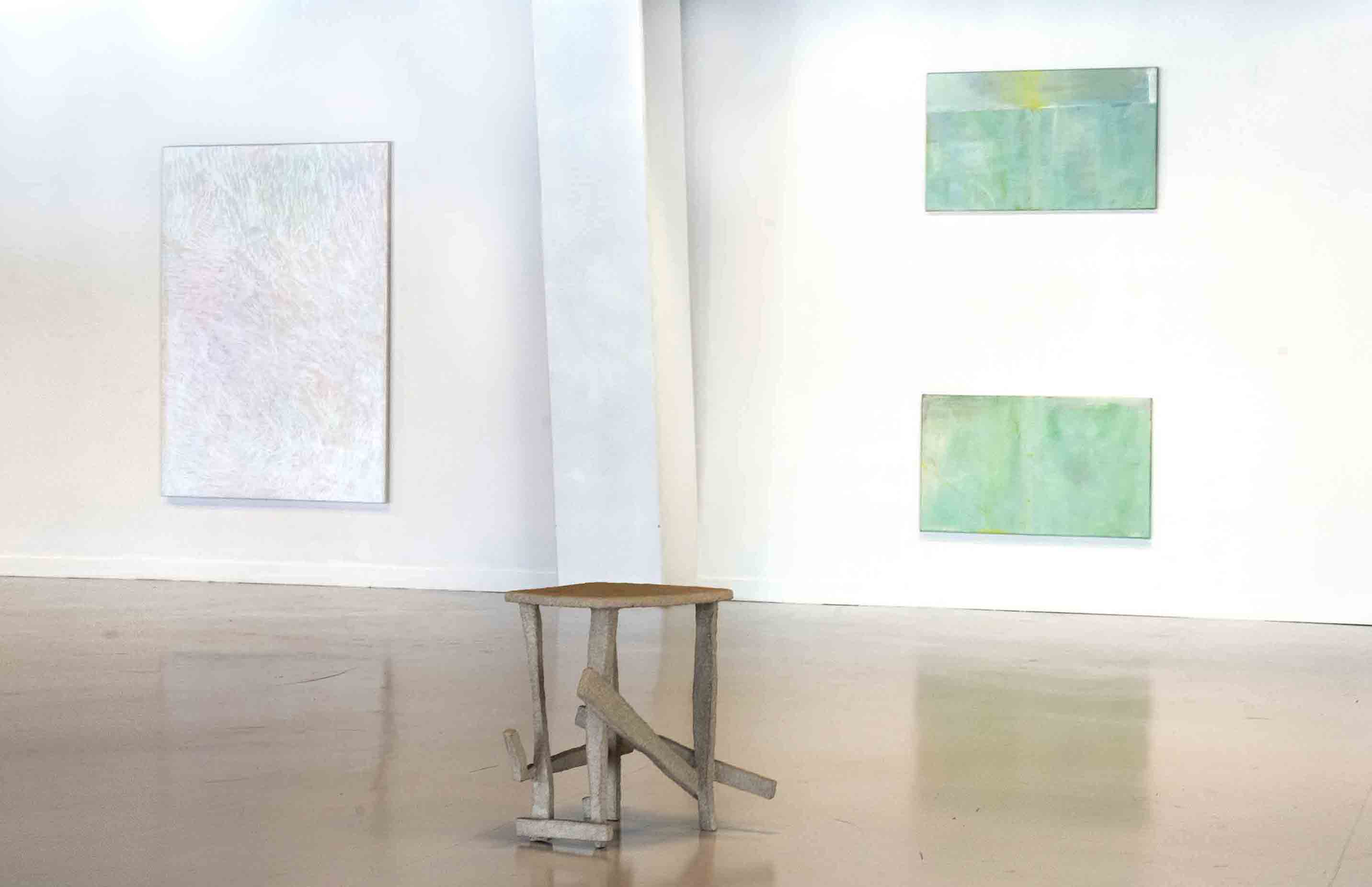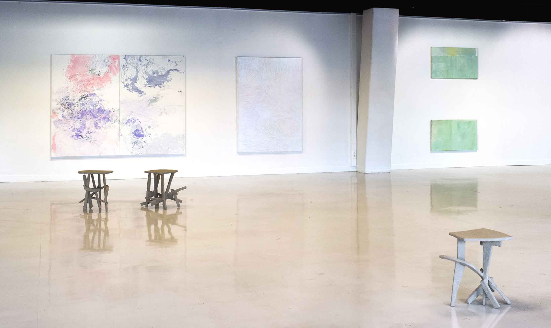 Aux côtés de ce trio, Maxence Chevreau propose de discrètes sculptures conçues comme des assises. Leurs placements dans l’espace matérialisent des points de vue depuis lesquels les visiteurs peuvent passer un moment en présence des peintures.