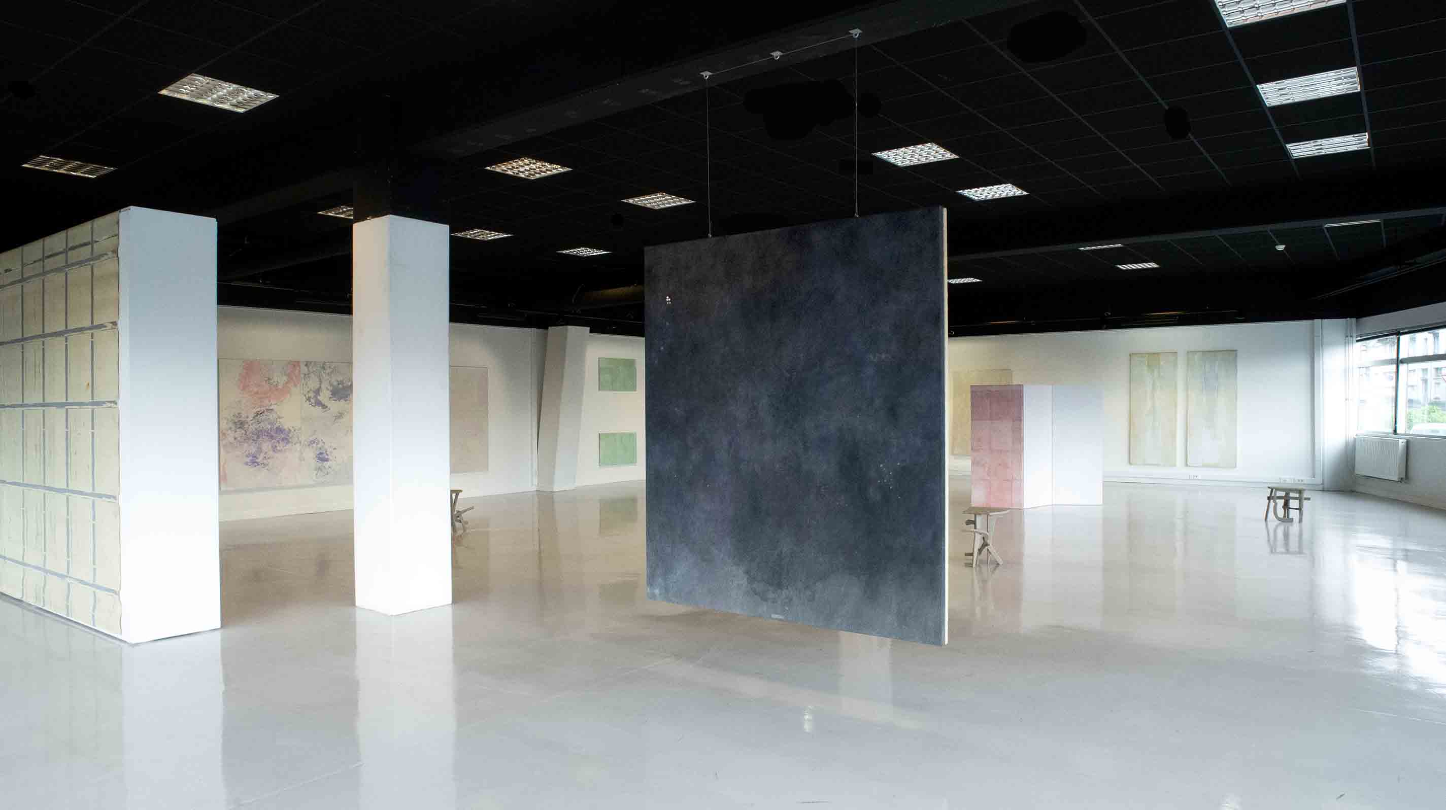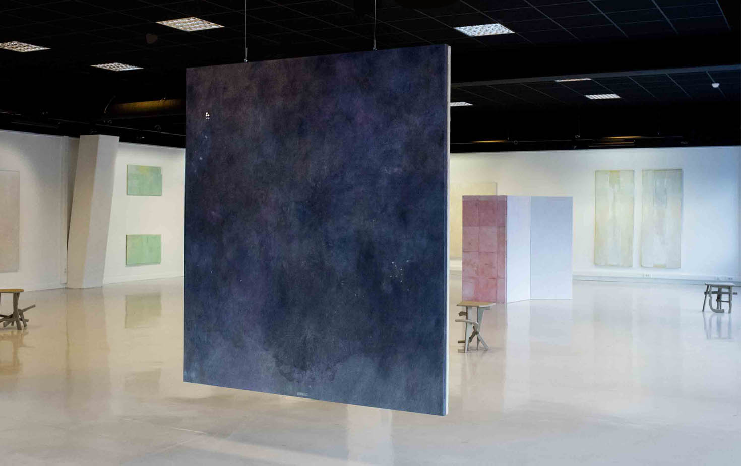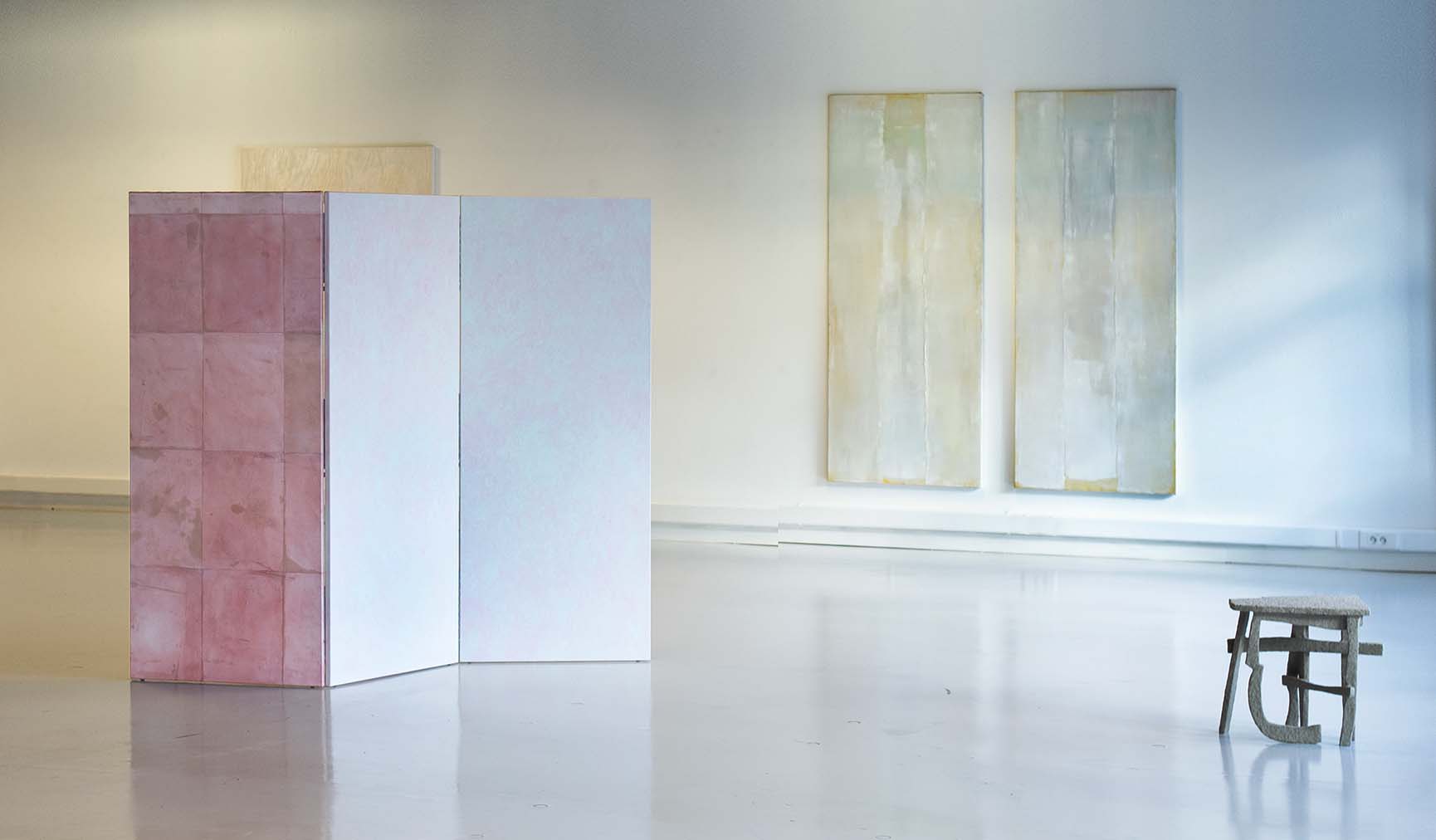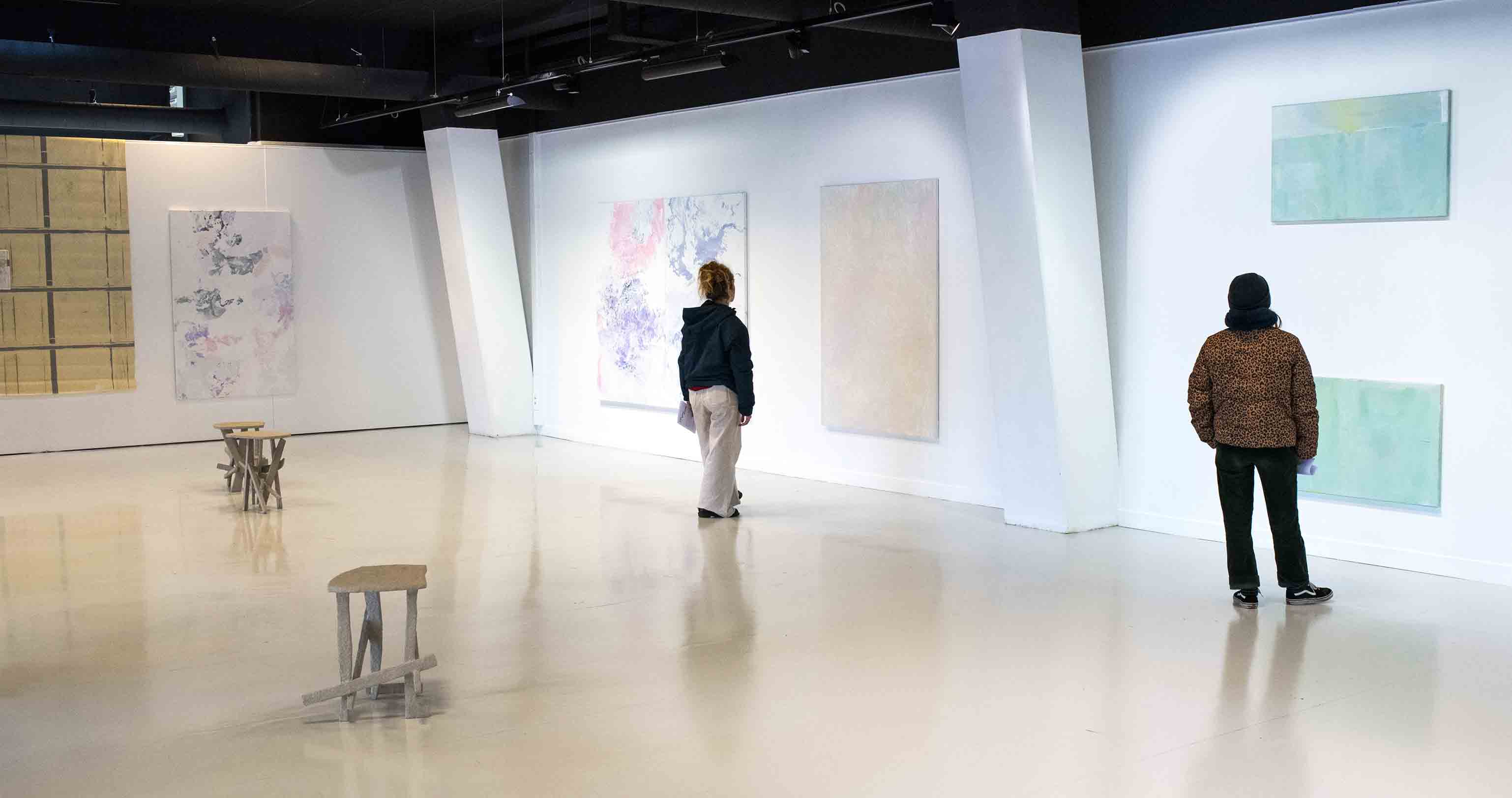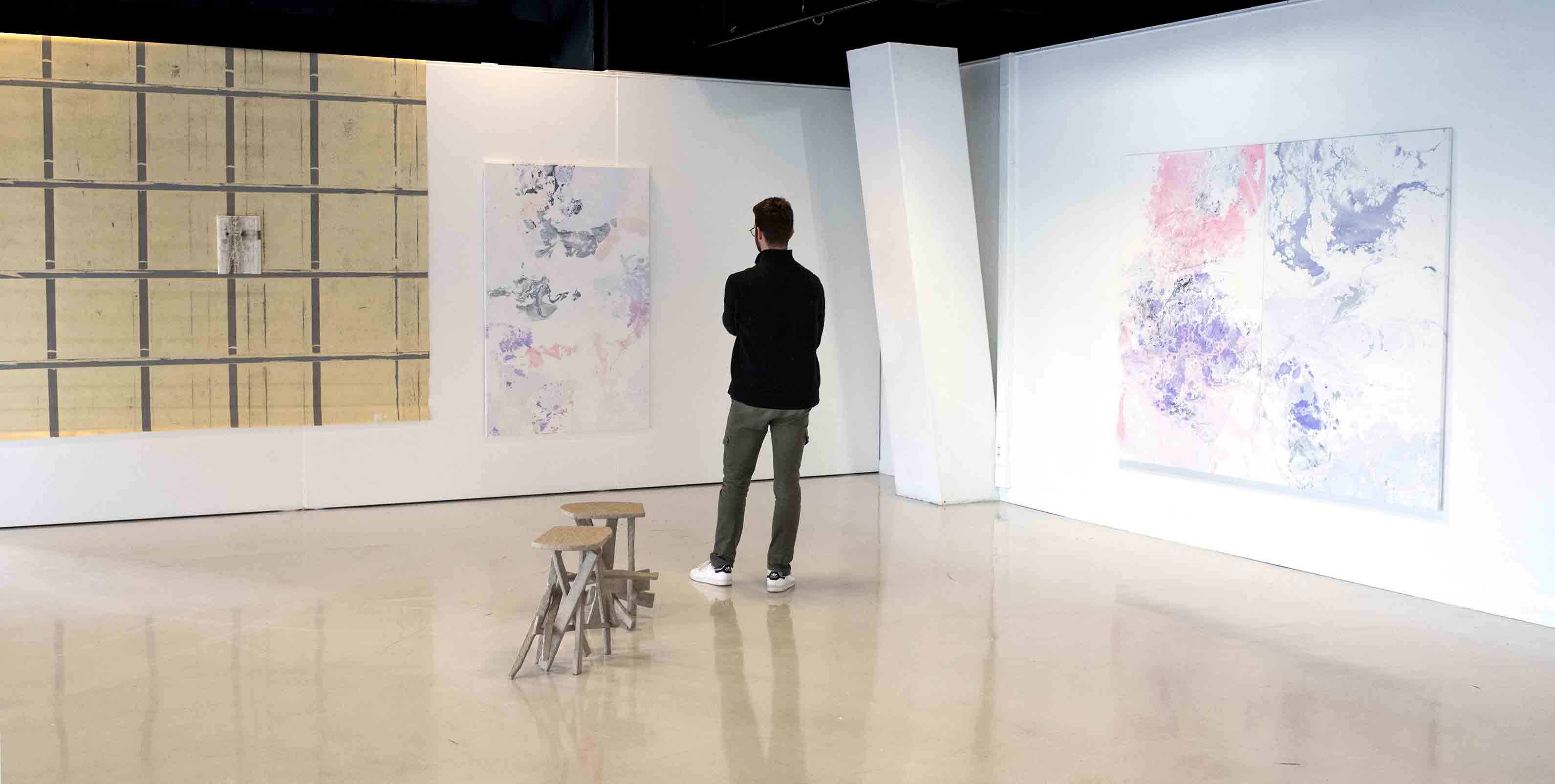 Aux côtés de ce trio, Maxence Chevreau propose de discrètes sculptures conçues comme des assises. Leurs placements dans l’espace matérialisent des points de vue depuis lesquels les visiteurs peuvent passer un moment en présence des peintures.